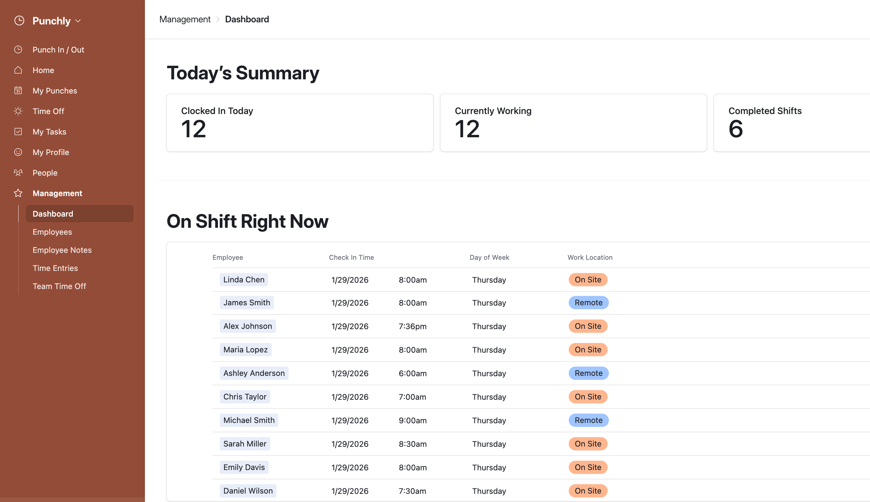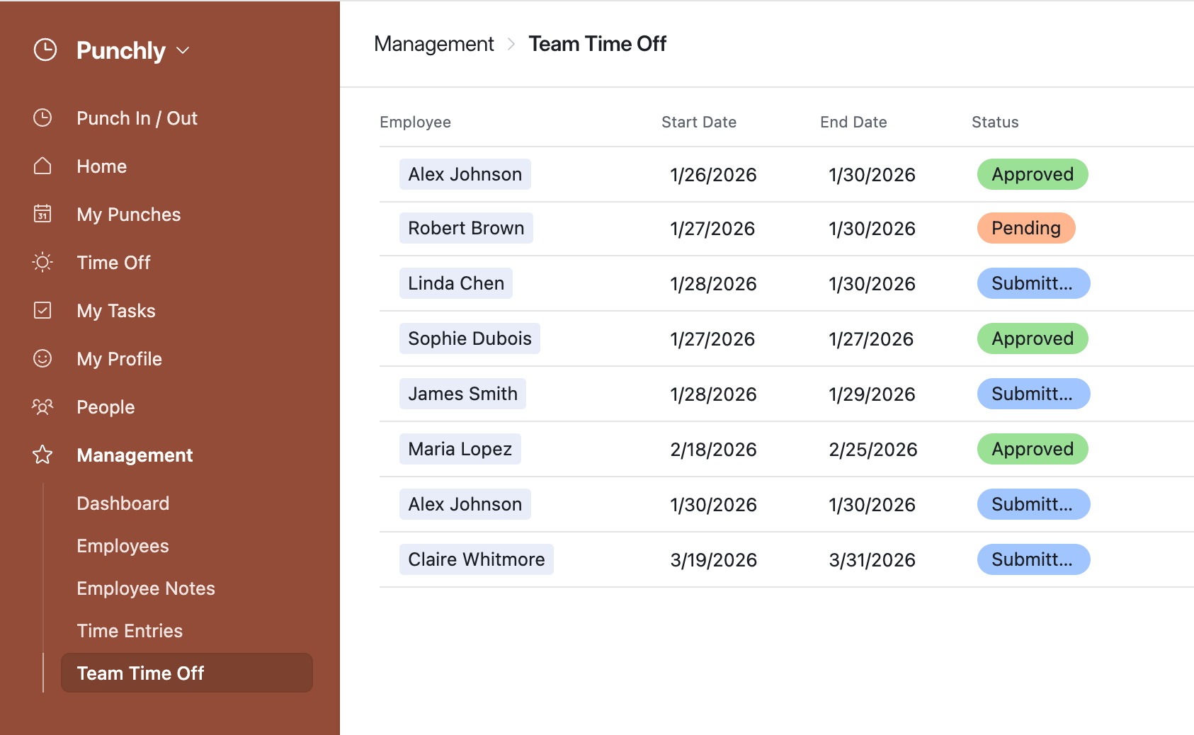 Punchly gives managers a clear view of attendance, hours, and time-off requests so nothing slips through the cracks.